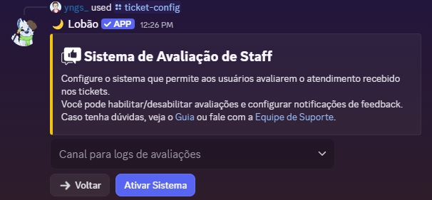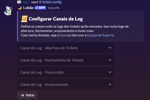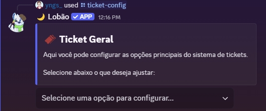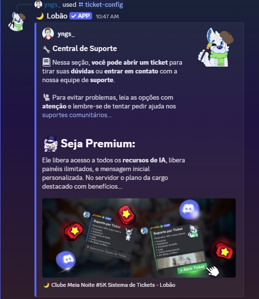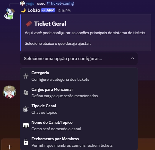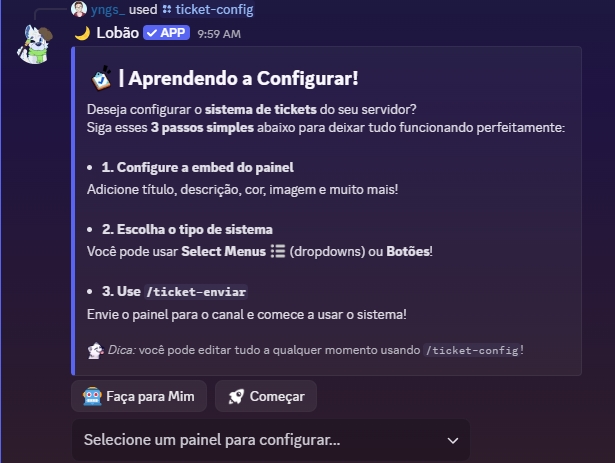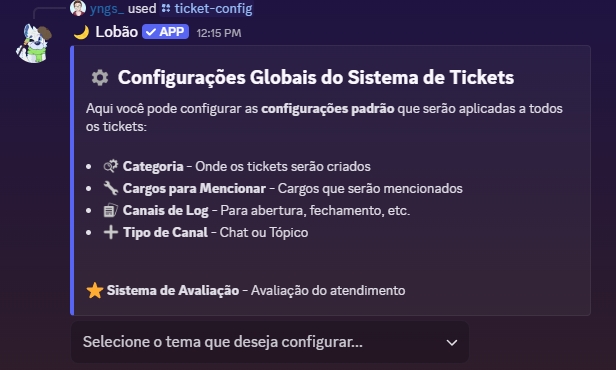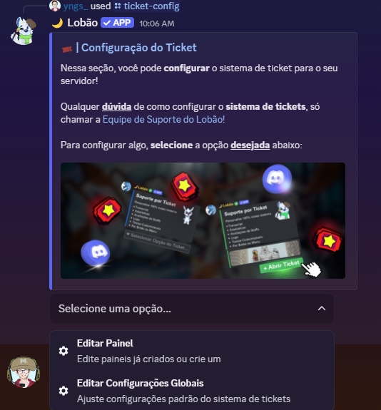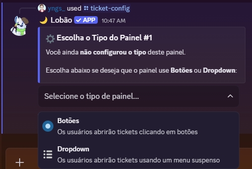 Atualmente o Lobão possui 2 tipos de painéis de ticket, sendo eles um por Botões e outro por Menu, ambos tem o mesmo intuito em ajudar os membros do seu servidor a serem atendidos de forma rápida e organizada. Fica a seu critério escolher qual dos modelos gostaria de usar de painel você vai mais gostar de utilizar.